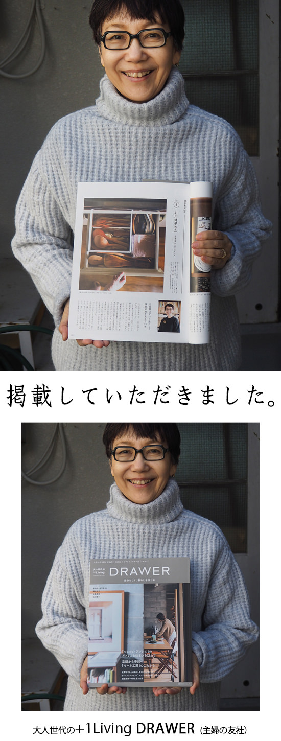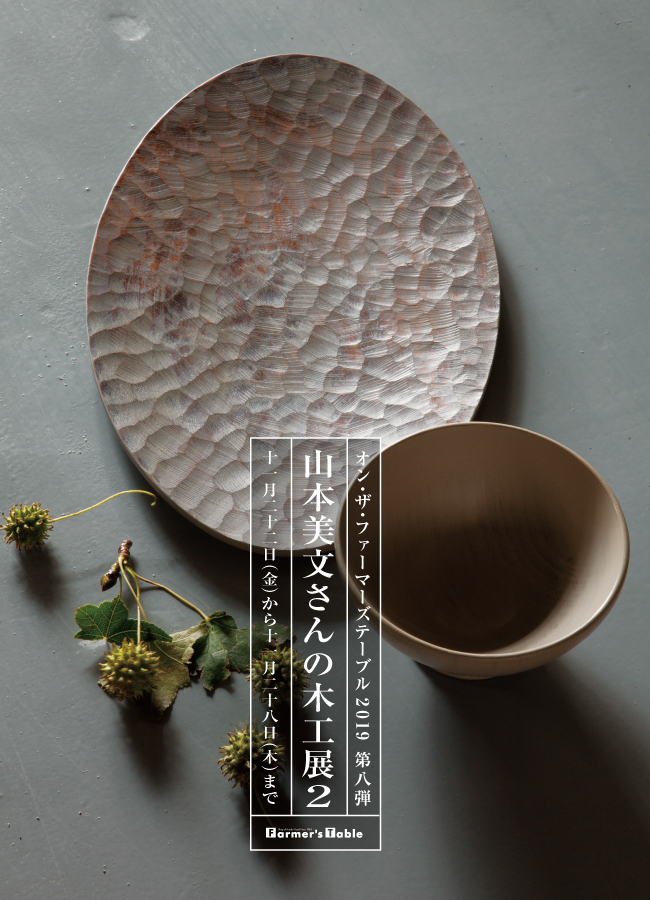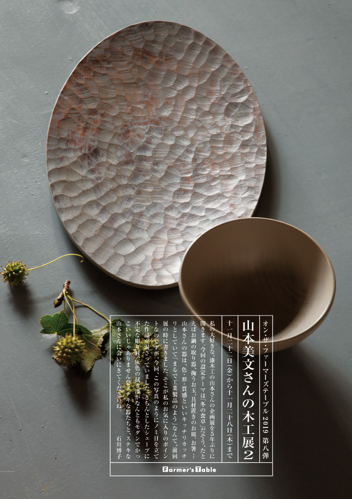 私の大好きな、漆木工の山本さんの企画展を5年ぶりに開きます。今回の設定テーマは「冬の食卓」だそう、たとえばお鍋の取り器、掬うお玉、具材置きのお皿,お箸…山本さんの器は、色・形・質感といいキッチリカッチリとしていて「まるで工業製品のよう」なんて、前回展の時に書きました。そこが私のお気に入りのポイントなのですが、今回、この写真のようにノミ目を立てた作品が混ざっていました。きちんとしたシェープに不定な彫り目、灰色の拭き漆がなんともモダンでかっこいいじゃありません⁉ステキな器たちと、ステキな山本さんに会いにきてくださいね。