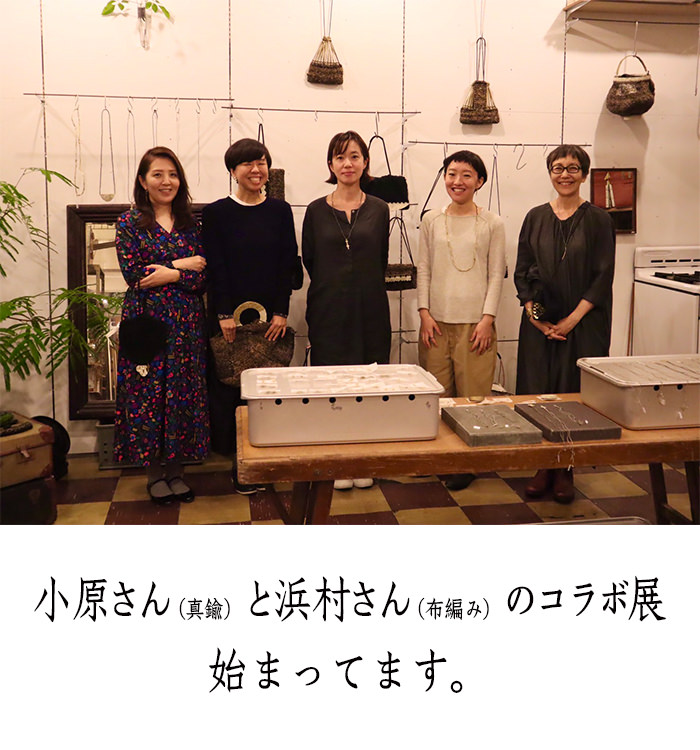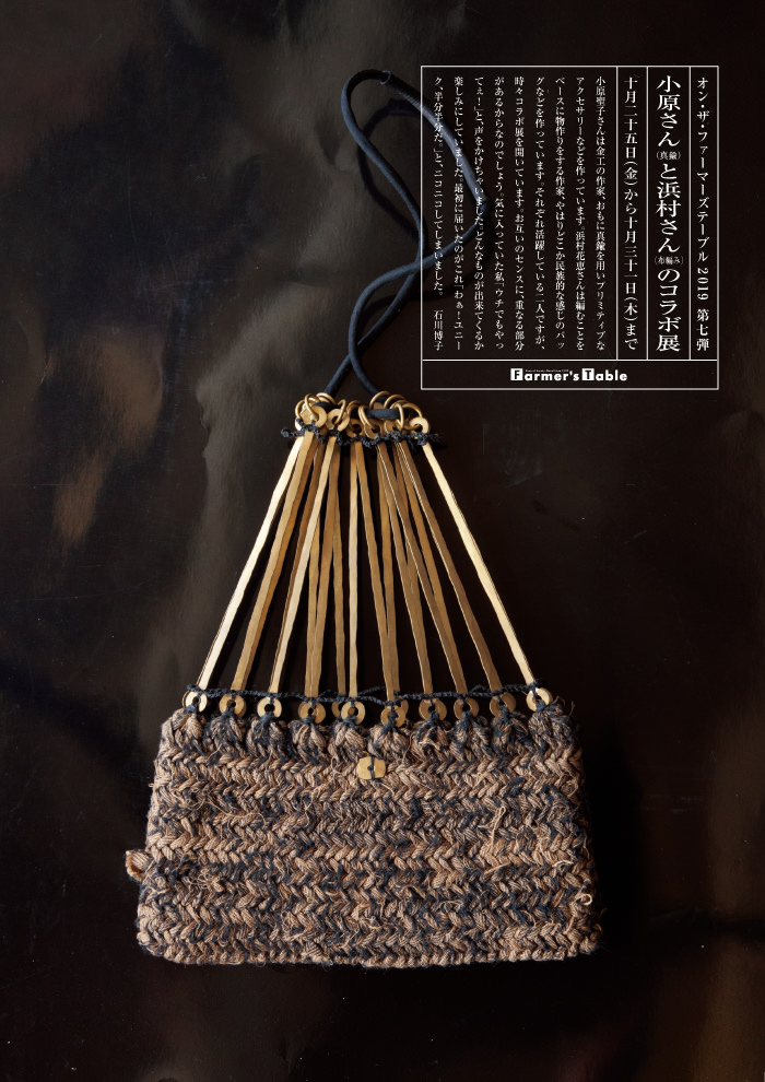 小原聖子さんは金工の作家、おもに真鍮を用いプリミティブなアクセサリーなどを作っています。浜村花恵さんは編むことをベースに物作りをする作家、やはりどこか民族的は感じのバッグなどを作っています。二人は仲良し、よく二人展を開いています。お互いのセンスに、重なる部分があるからなのでしょう。「ねえ、布編みのバックに真鍮のパーツが「対等に」からむコラボ展やってみない?」と提案してみました。やろう!やろう!と賛同をいただきました。どんなものが出来てくるか楽しみにしていた私、最初に届いたのがこれ「わぁ!ユニーク、半分半分だ。」と、ニコニコしてしまいました。