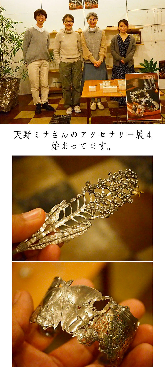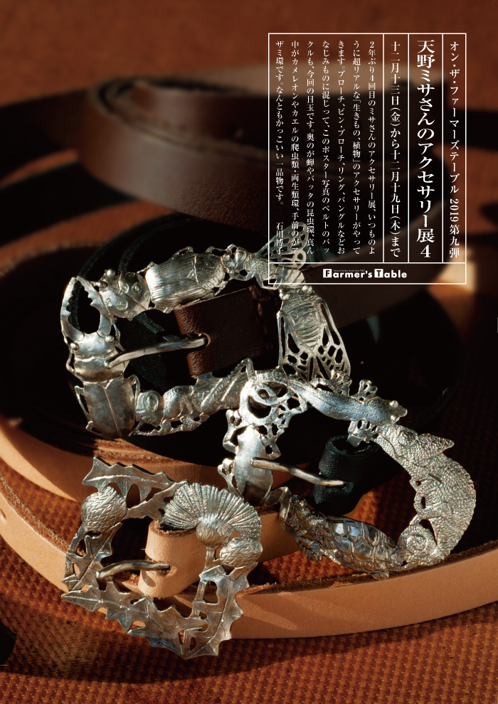 2年ぶり4回目のミサさんのアクセサリー展、いつものように超リアルな「生きもの、植物」のアクセサリーがやってきます。ブローチ、ピン・ブローチ、リング、バングルなどおなじみものに混じって、このポスター写真のベルトのバックルも、今回の目玉です。奥のが蝉やバッタの昆虫環、真ん中がカメレオンやカエルの爬虫類・両生類環、手前のがアザミ環です。なんともかっこいい一品物です。