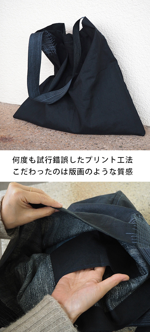 版画のような布をイメージして、まるで表面にペンキを塗ったような生地の質感に魅せられて、私もこのバッグを使い始めました。