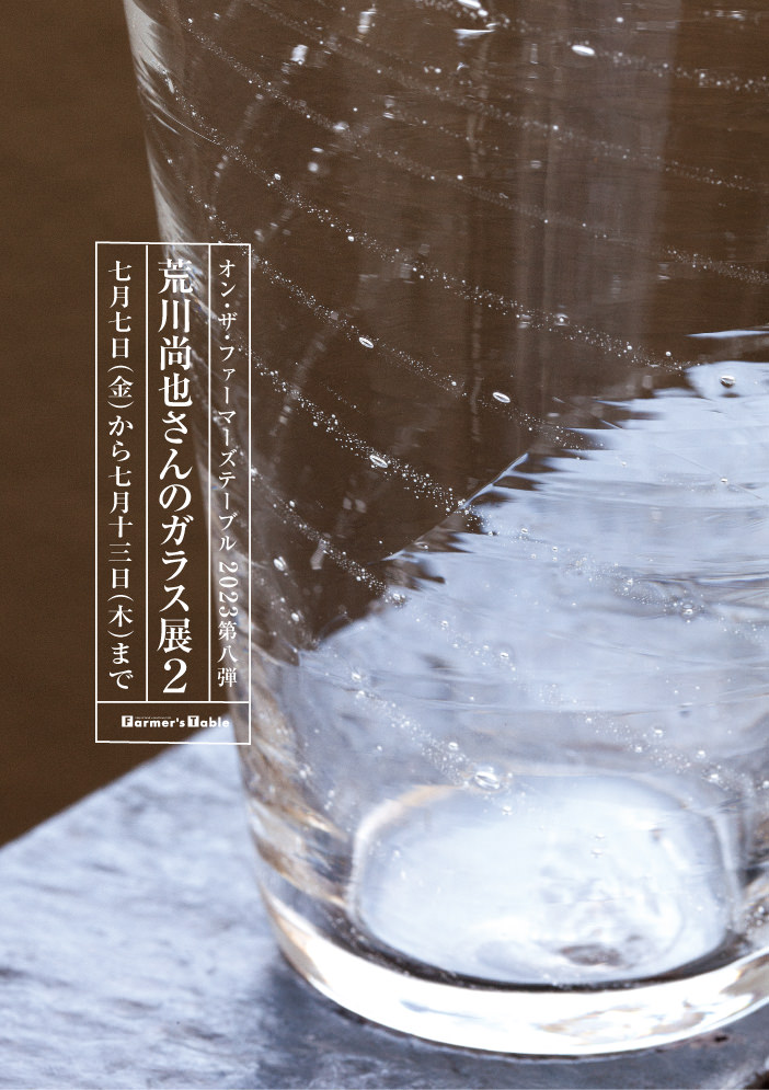 ファーマーズテーブル定番の顔、荒川尚也さんの企画展となります。40年ほど前あの同潤会アパートの3階のテーブルに並べたのグラス達は時を経て愛され続けています。螺旋状に昇る泡の流れを閉じ込めたガラスの清涼感は今も新鮮です。