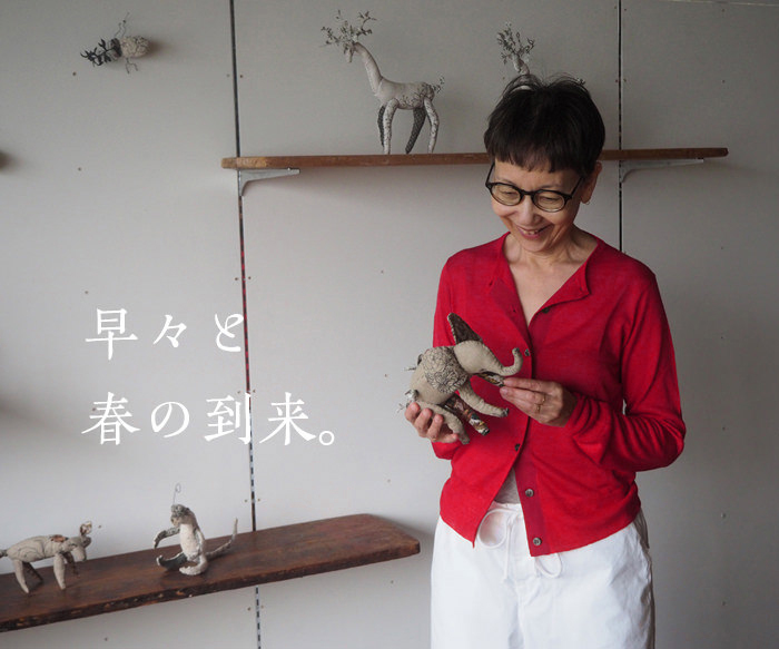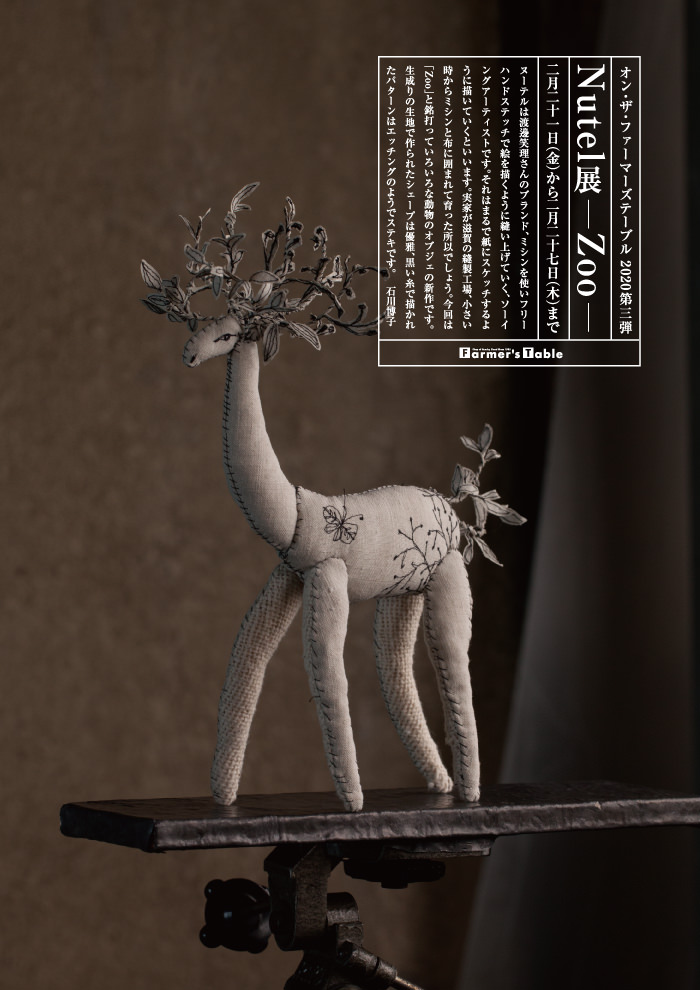 ヌーテルは渡邊笑理さんのブランド、ミシンを使いフリーハンドステッチで絵を描くように縫い上げていく、ソーイングアーティストです。それはまるで紙にスケッチするように描いていくといいます。実家が滋賀の縫製工場、小さい時からミシンと布に囲まれて育った所以でしょう。今回は「Zoo」と銘打っていろいろな動物のオブジェの新作です。生成りの生地で作られたシェープは優雅、黒い糸で描かれたパターンはエッチングのようでステキです。