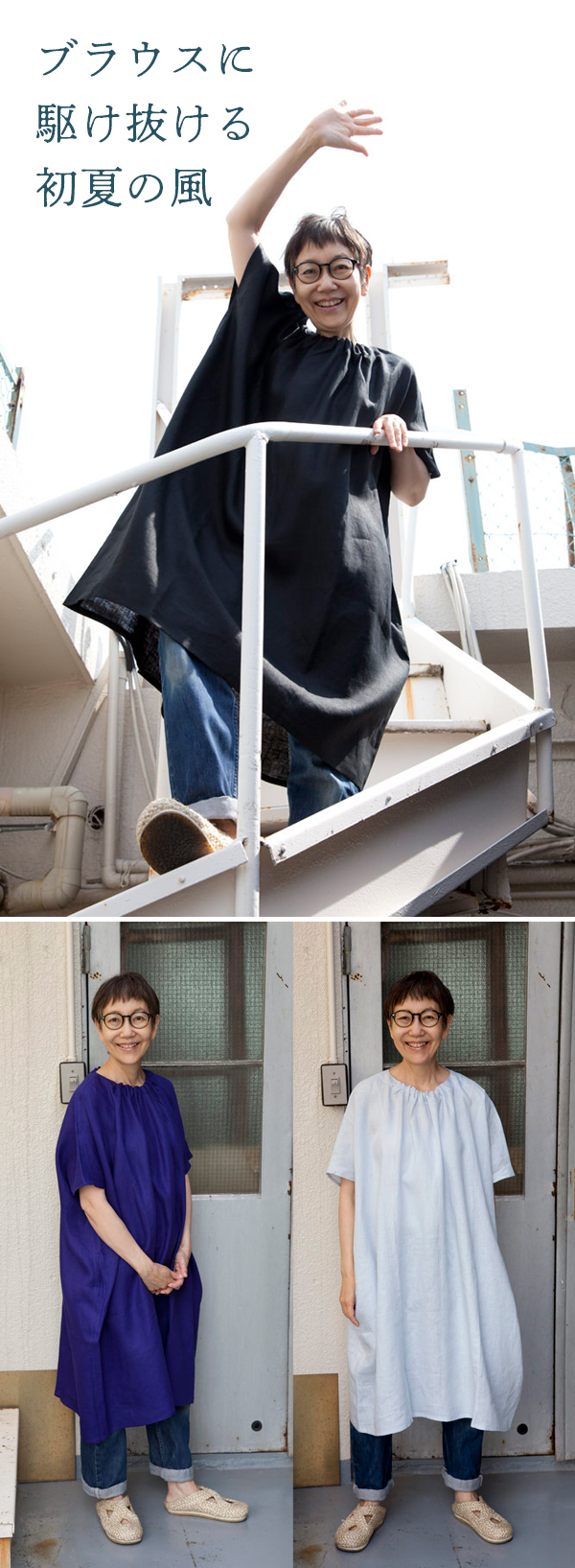夏場になれば、前をしっかり止めてノースリーブワンピースとしても。