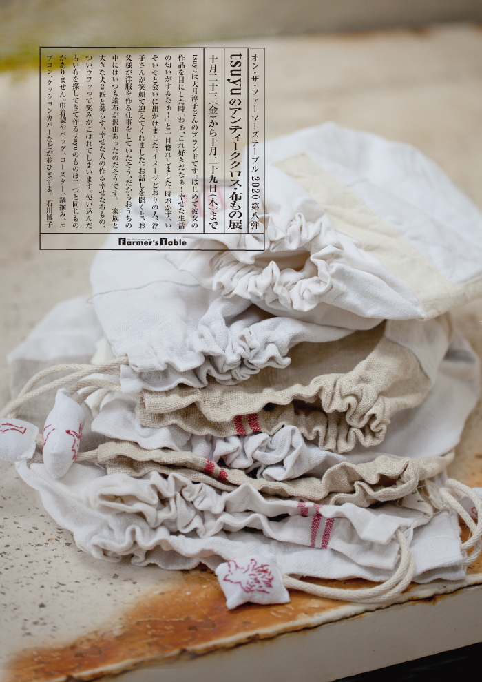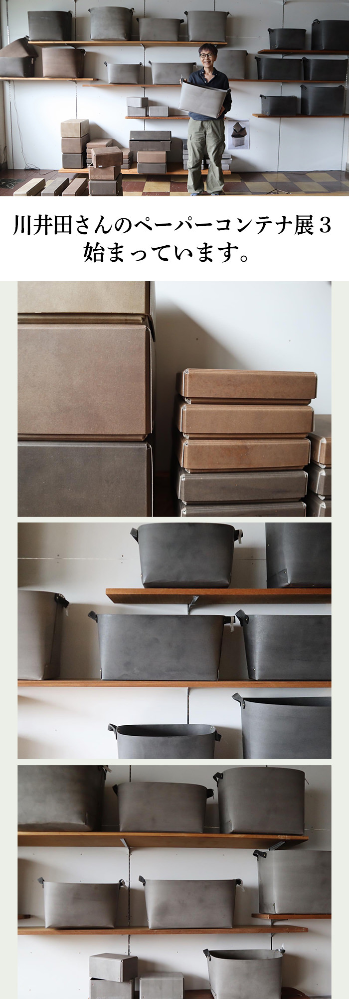 川井田さんのコンテナ展、2年ぶり3回目を開きます。今ではすっかり、ファーマーズテーブルの定番商品としておなじみ、人気のアイテムです。いつものブラウンとダークブラウンに加えて今回はグレイの新作が届きました。写真の一番下のがそれです。子供たちのオモチャ入れ,洗濯物入れなど、見える収納にステキです。ちなみに我が家では洗濯物入れになっていますよ。ビッグサイズトートの他、各種ボックス類も並びます。一級建築士・川井田さんならではの、構造デザインの美、素材の(柿渋を吸わせた厚手の紙に蝋引き)味わい、お楽しみに。
