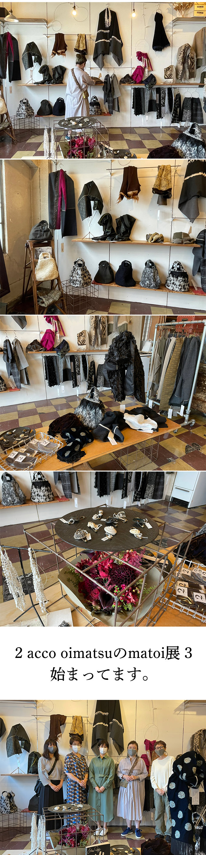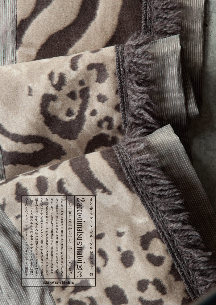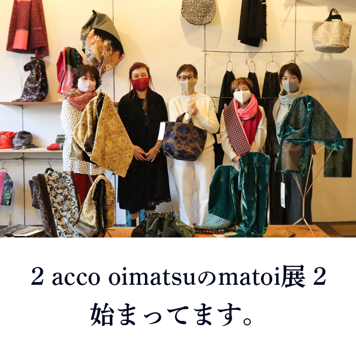 今年も大人気の 2 accooimatsu の企画展が始まります。相変わらず老松明子さんの巻きものは、耽美的とでも言うのでしょうか、ちょっと怪しげで魅惑的です。世界各国から集めた、とっておきの布やパーツが見事なセンスで構成・コラージュされています。そのままシックに着こなすも良し、ラフに巻き倒すのも良しです。ちなみに私は後者かな。笑