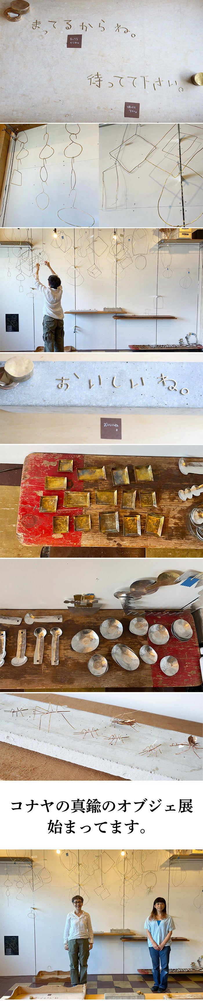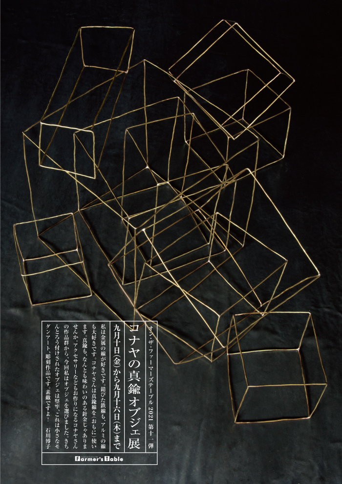 私は金属の線が好きです。錆びた鉄線も、アルミの線も大好きです。コナヤさんは真鍮線を(おもに)使います。真鍮も、なんとも味わいのある針金じゃありませんか。アクセサリーなどもお作りになるコナヤさんの作品群から、今回私はオブジェを選びました。きちんとろう付けされたオブジェは堅牢、これは小さなモダンアート、彫刻作品です。素敵ですよ!