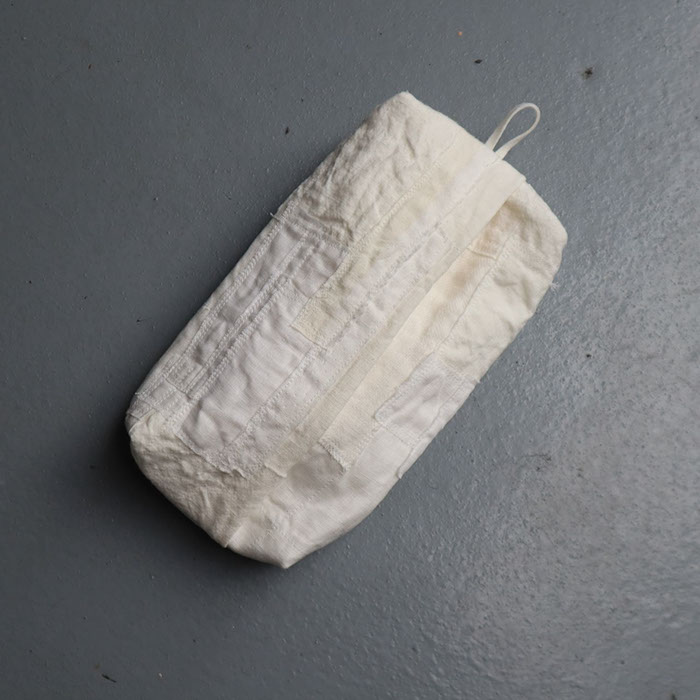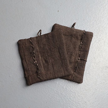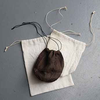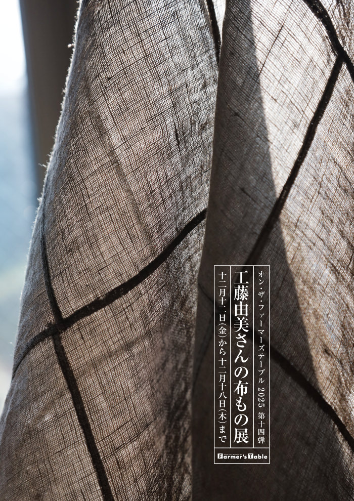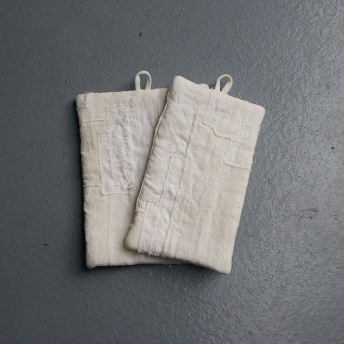 工藤由美さんは天然染色を施した布を用いて、いつも素敵な暮らしまわりの布小物をつくってもらっています。今回企画展では巾着、トート、鍋掴み、布巾、エプロン、コースター、ティッシュカバー、さらに大きめの細長いテーブルランナー、クッションケース、パッチワーククロス(ポスター掲載品)など並びます。由美さんの使う布はリネンです。今回は無地と柿渋染めの素材。それぞれに趣があり気持ちがいいです。