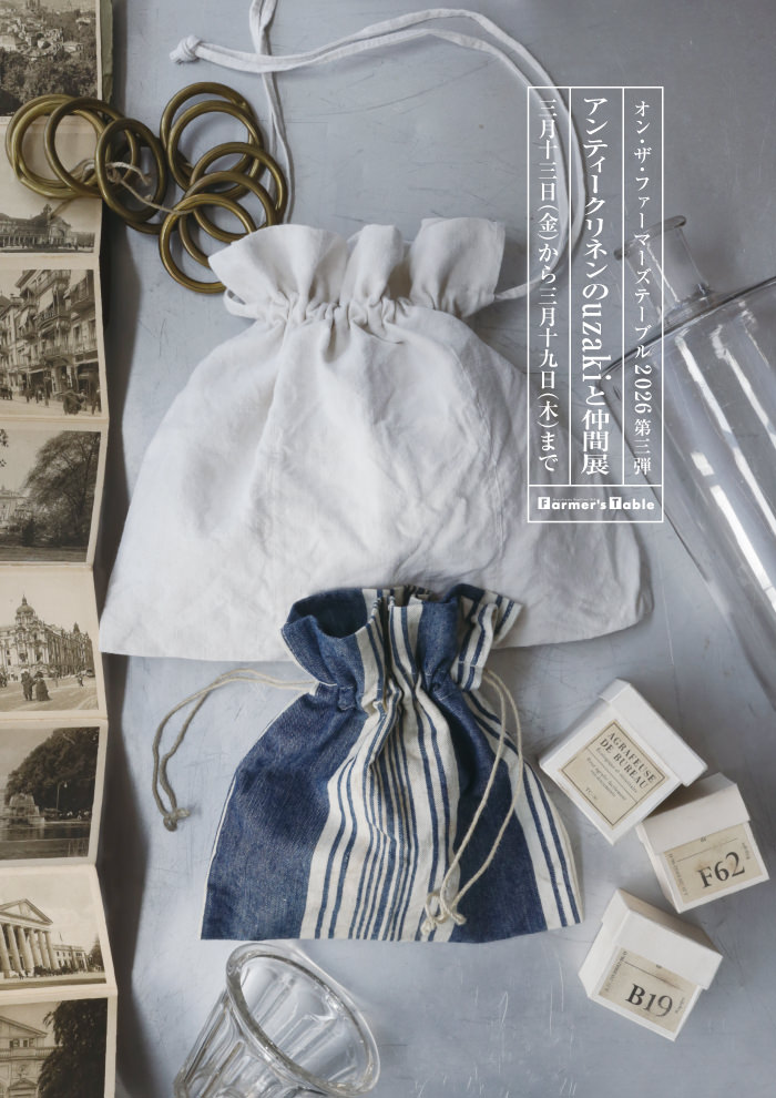 今までの企画展ではウザキヨシエさんの作品と彼女が集めていたアンティークでの展示でしたが、今回は彼女と感性が響きあう素敵な方々とがコラボレーションするオン・ザ・ファーマーズテーブルの空間を見れるのが楽しみです!
